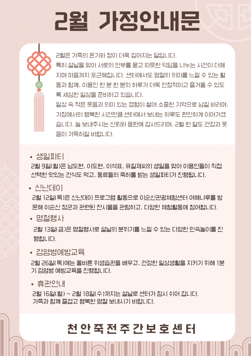 2026년 2월 가정안내문 페이지 정보 작성자 김미리 작성일26-01-29 16:17 조회2회 댓글0건 다음글 목록 본문 2월 가정안내문입니다. 댓글목록 등록된 댓글이 없습니다. 다음글 목록
