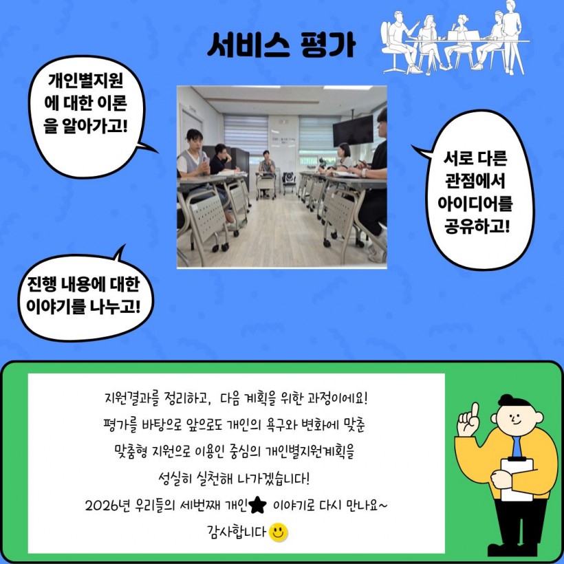 2026년에도 이용인의 욕구와 변화에 맞춘 맞춤형 지원으로 이용인 중심의 개인별지원계획을 성실히 실천해 나가겠습니다. 감사합니다.