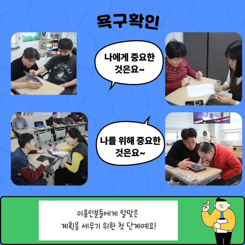 우리 센터에서는 2025년 개인별지원계획 '나의 이야기' 서비스를 통해 이용인에게 중요한것과 이용인을 위해 중요한 것을 계획하고 실천하는 시간이 되었습니다.