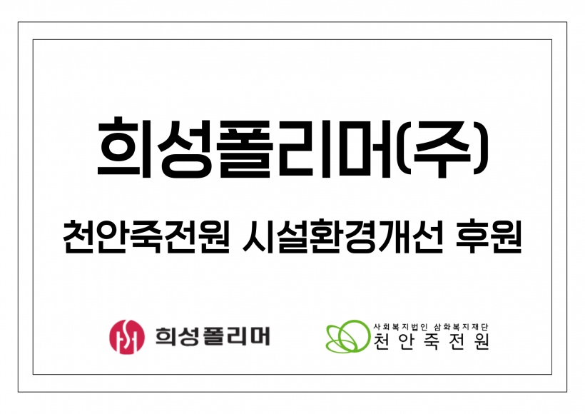 항상 천안죽전원의 환경개선사업 및 공사를 진행할 때, 따뜻한 관심과 나눔을 해주시는 희성폴리머가 있기에 이용자분들이 생활하실 때 밝은 미소와 즐거운 에너지가 넘치시는 것 같습니다.