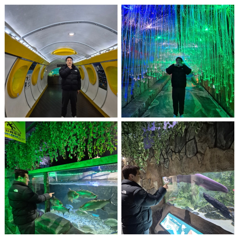 푸른 파도 같은 조명이 춤추고, 수많은 해양생물들이 유영하는 모습을 눈으로 따라가다 보니 어느새 마음도 함께 물결처럼 잔잔해졌습니다.