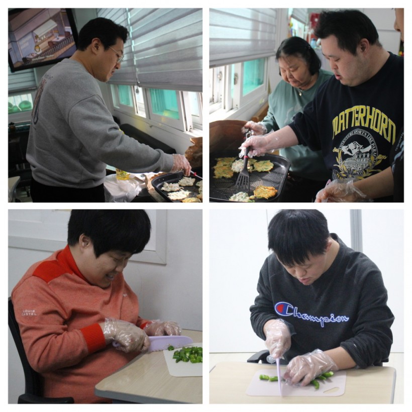 오후에는 본격적인 요리 시간! 봄 향기 가득한 봄동과 바지락을 손질하며 바지락살을 정성껏 발라내고, 채소도 직접 썰어 보았습니다. 전기팬 위에서 노릇노릇 익어가는 소리와 고소한 향기에 모두의 얼굴에도 기대가 번졌습니다.